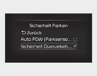 Wählen Sie, wenn der Zündschalter oder Knopf ENGINE START/STOP (Motorstart/-stopp) in Position On steht, im Einstellungsmenü auf dem LCD-Display oder Infotainmentsystem die Option „Benutzereinstellungen → Fahrerassistenz → Parksicherheit“ aus, um festzulegen, welche Funktionen verwendet werden sollen.