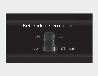 Wenn die Kontrollleuchten des Reifendruck-Überwachungssystems leuchten und eine Warnmeldung auf dem LCD-Display des Kombiinstruments angezeigt wird, ist der Reifendruck in mindestens einem Reifen zu niedrig. Die Positionskontrollleuchte für Reifen mit geringem Reifendruck zeigt an, in welchem Reifen der Reifendruck erheblich zu gering ist. Dazu wird die Position des Reifens durch eine Warnleuchte signalisiert.