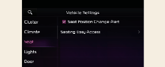 Select Settings → Vehicle → Seat from the Settings menu in the infotainment system screen, you may use various convenience functions.