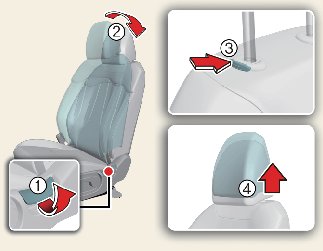 To lower the headrest, push and hold the release button (2) on the headrest support.
