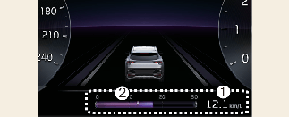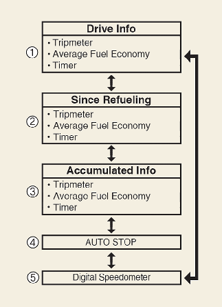 This display shows the trip distance (1), the average fuel efficiency (2), and the total driving time (3) information once per one ignition cycle.