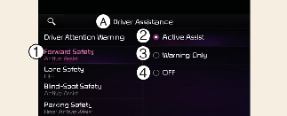 With the vehicle on, select Settings → Driver assistance → Forward safety from the User Settings menu or select Settings → Vehicle → Driver assistance → Forward safety from the infotainment system to set whether or not to use each function.