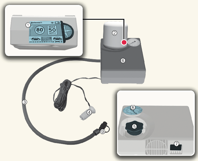 * Connectors, cable and connection hose are stored in the compressor housing.