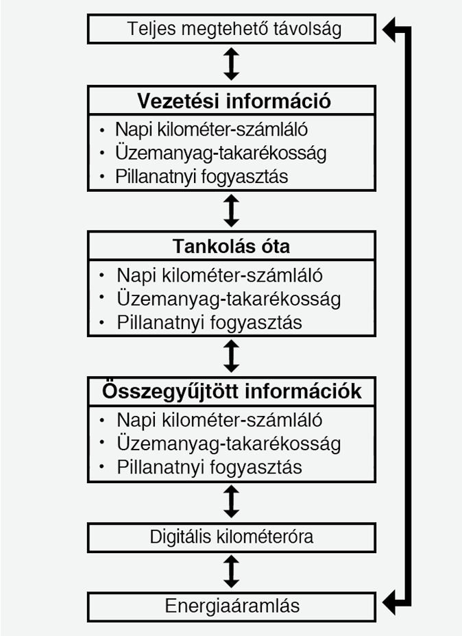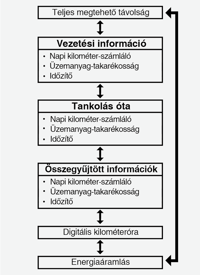 A rendszer által kijelzett hatótávolság eltérhet a tényleges üzemanyagszinttel megtehető távolságtól, hiszen ez csak egy becsült érték.