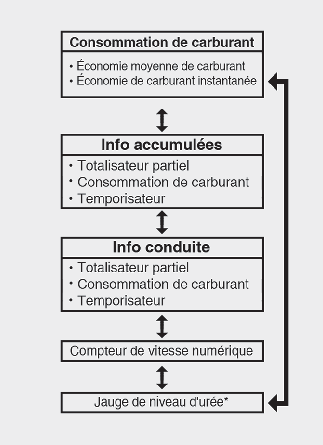 L'économie moyenne de carburant ne s'affiche pas pour un calcul plus précis si le véhicule n'a pas roulé plus de 10 secondes ou 300 mètres (0,2 miles) depuis l'activation (ON) du contacteur d'allumage.