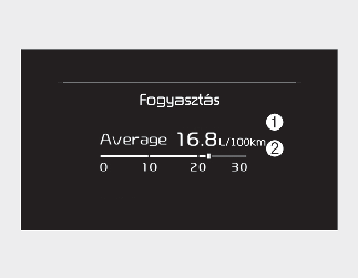 A rendszer az átlagfogyasztást a számláló utolsó visszaállítása óta megtett teljes távolság és elfogyasztott üzemanyag-mennyiség alapján számítja ki.