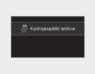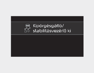 Nyomja meg és tartsa 3 másodpercnél tovább lenyomva az ESC OFF gombot. Az ESC OFF (ESC ki) ellenőrző lámpa és üzenet felkapcsolódik és az ESC OFF figyelmeztető hangjelzés megszólal. Ebben az állapotban a motorvezérlés és a fékszabályozás funkció nem működik. Ez azt jelenti, hogy az autó stabilizáló funkciója ez után már nem működik.