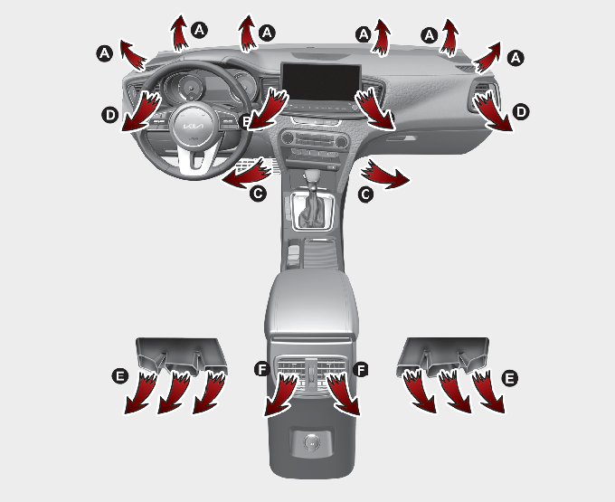 O caudal de ar é dirigido maioritariamente para o chão, com uma pequena quantidade a ser dirigida para os desembaciadores das janelas laterais.