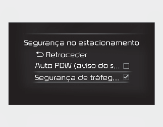 Com o interruptor da ignição ou o botão ENGINE START/STOP (Ligar/desligar o motor) na posição Ligado, selecione “Definições → Assistência ao condutor → Segurança no estacionamento" no painel de instrumentos ou em “Definições”→ Veículo → Assistência ao Condutor → Segurança no estacionamento” no sistema de infotainment para definir se pretende ou não utilizar cada função.