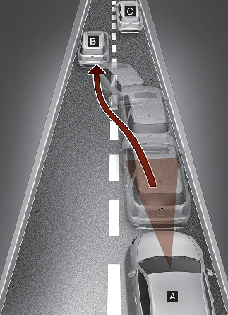 Quando um veículo à sua frente sai da faixa de rodagem, a Assistência à prevenção de colisão frontal poderá não detetar imediatamente o veículo [C] que está agora à sua frente. Neste caso, deverá manter uma distância segura de travagem e, caso seja necessário, manobre o veículo e carregue no pedal do travão para reduzir a sua velocidade de condução, de forma a manter uma distância segura.