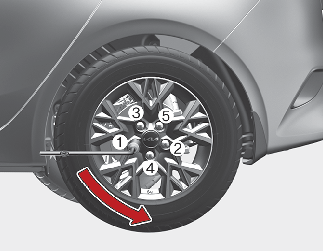 Em seguida, coloque a chave de rodas como se mostra na figura e aperte as porcas da roda. Certifique-se de que a chave encaixa completamente na porca. Não se apoie no manípulo da chave de rodas nem utilize um tubo de extensão sobre o manípulo da chave. Verifique bem a roda apertando todas as porcas seguindo a ordem numérica indicada na imagem até todas estarem apertadas. Volte a verificar o aperto de cada roda. Depois de mudar as rodas, mande verificar o sistema numa oficina profissional. A Kia recomenda que visite um concessionário/parceiro de serviços autorizado Kia.
