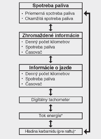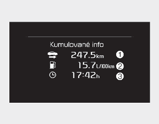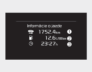 Na tomto displeji sa zobrazia informácie o vzdialenosti jazdy (1), priemernej spotrebe paliva (2) a celkovom čase jazdy (3) za jeden zapaľovací cyklus.