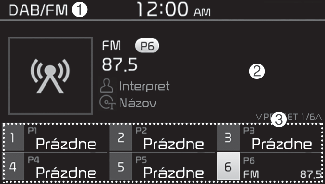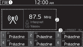 Scan (Hľadanie): Systém vyhľadáva rozhlasové stanice so silnými rádiovými signálmi a každú rozhlasovú stanicu prehrá približne päť sekúnd.