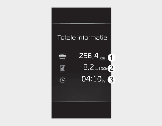 Het display toont de geaccumuleerde ritafstand (1), het gemiddelde brandstofverbruik (2) en de totale rijtijd (3).