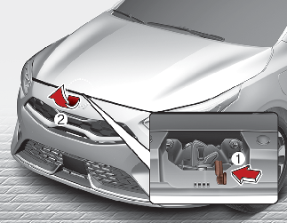 Vaya a la parte delantera del vehículo, eleve el capó ligeramente, después tire del enganche (1) interior del centro del capó