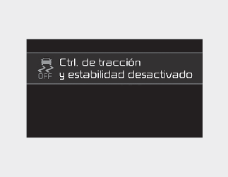 Pulse el botón ESC OFF durante más de 3 segundos. El testigo indicador ESC OFF se encenderá, aparecerá un mensaje y sonará una señal acústica de aviso de ESC OFF. En este estado, la función de control del motor y la función de control de los frenos no están operativas. En otras palabras, la función de control de estabilidad del vehículo no está operativa.
