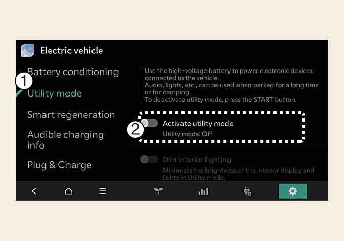 Uporabni način lahko izklopite s pritiskom na gumb EV, da ga nastavite v položaj OFF. Funkcije ni mogoče izklopiti prek menija Električno vozilo.