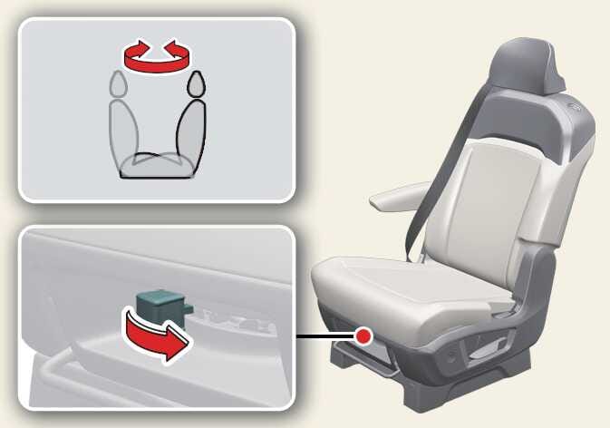 Potegnite ročico za obračanje v desno (sedež na desni strani vozila) ali levo (sedež na levi strani vozila) in obrnite sedež v vozilo ali iz njega.