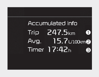This display shows the trip distance (1), the average fuel efficiency (2), and the total driving time (3) information once per one ignition cycle.