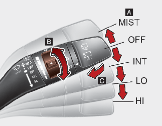 MIST: For a single wiping cycle, move the lever to this (MIST) position and release it. The wipers will operate continuously if the lever is held in this position.