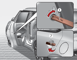 The child safety lock is located on the edge of each rear door. When the child safety lock is in the lock position (1), the rear door will not open if the inner door handle (2) is pulled.