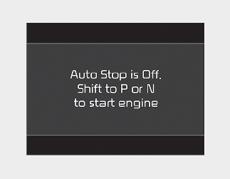 If you move the transmission lever from N to D (manual mode) or R without depressing the brake pedal after stopping engine automatically, the engine does not restart automatically and a warning chime alarms. When this happens, press the brake pedal for auto start.