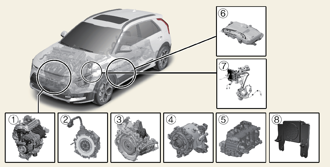 Bilen er utstyrt med oransje isolasjon og deksler over alle høyspentkomponenter for å beskytte mot elektriske støt. I tillegg har noen systemkomponenter varselmerker om høyspenning. Få utført service på bilen på et profesjonelt verksted. Kia anbefaler at du oppsøker en godkjent Kia-forhandler/servicepartner.