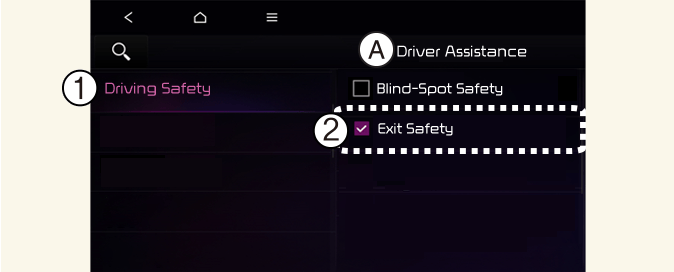 Med kjøretøyet på, trykk på Innstillinger → Kjøretøy → Førerassistanse → Kjøresikkerhet → Utgangssikkerhet på instrumentpanelet eller Innstillinger → Kjøretøy → Førerassistanse → Kjøresikkerhet → Sikker utgang på infotainment-systemet.