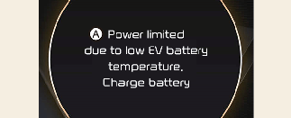 在車外溫度較低的情況下關閉或打開車輛時,會顯示此警告訊息以保護電動車輛系統。如果高壓電瓶充電量低,而車輛長時間停放在室外的低溫環境,車輛動力可能會受限。開車前為電瓶充電,可以提高電瓶溫度,有助增加動力。