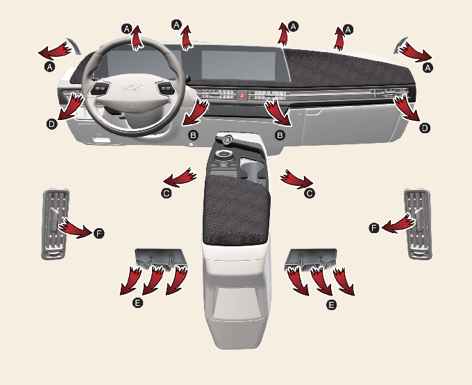 大部分氣流指向足部,少量空氣指向擋風玻璃、側面門窗除霜器、以及側通風孔。 |