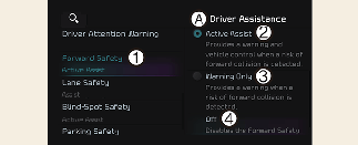 主動輔助:前方碰撞預防輔助將依照碰撞風險等級向駕駛發出警告訊息、警告音,並且方向盤會振動。將依照碰撞風險使用煞車輔助或轉向輔助(如有配備)。