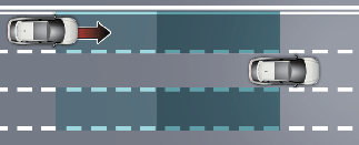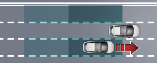 在變換車道偵測前方車道時,如果盲區防撞輔助功能判斷與盲點駛近的車輛存在碰撞危險,該功能將應用煞車以協助避免碰撞。