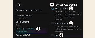 主動輔助:盲區防撞輔助功能將依照碰撞風險等級向駕駛發出警告訊息、警告音、方向盤震動並應用煞車輔助。