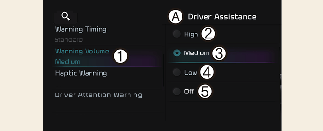 車輛啟動時,輕觸資訊娛樂系統上的設定→車輛→駕駛輔助→警示音量,來調整警示音量;高、中、低及靜音。
