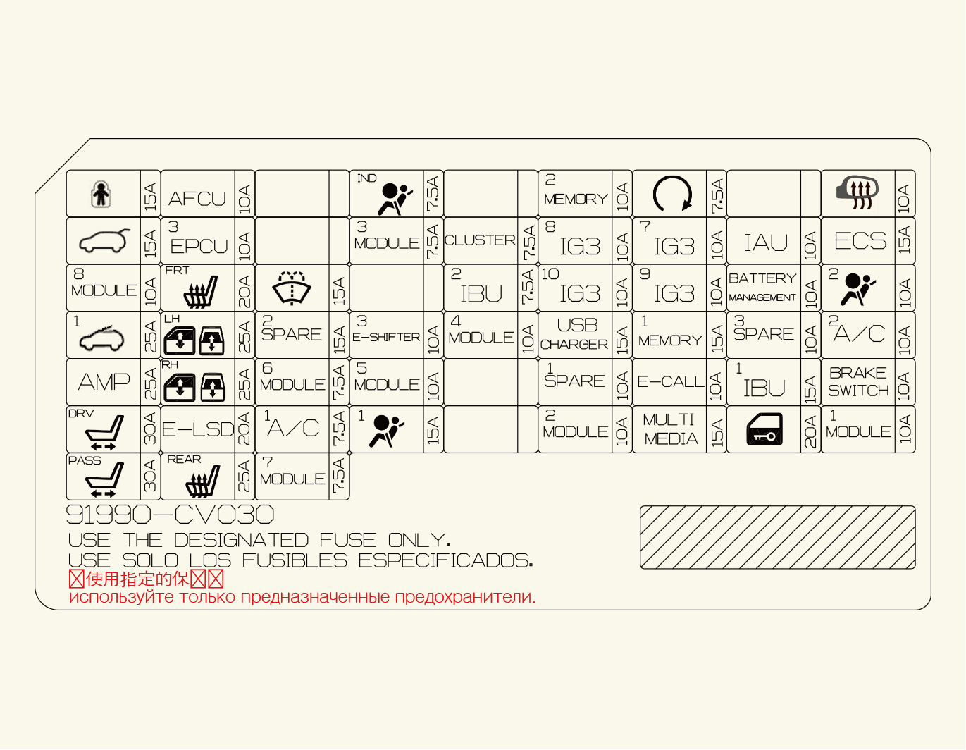 資料連結連接器、電致變色鏡、E-CALL 單元、ADP、音訊/視訊和導航主機、防撞墊開關、大燈 LH/RH、AMP(放大器)、智慧型手機無線充電器、駕駛座/副駕駛座電動座椅模組、 前排空氣通風座椅控制模組、前排座椅加熱器控制後排座椅加熱器控制模組、控制台底板開關、自動大燈水平調整裝置模組、IFS(智慧前照明系統)模組 |