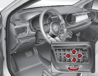 Każdy wylot można otwierać lub zamykać osobno za pomocą pokrętła. Aby zamknąć otwór wentylacyjny, należy go obracać maksymalnie do dołu.
