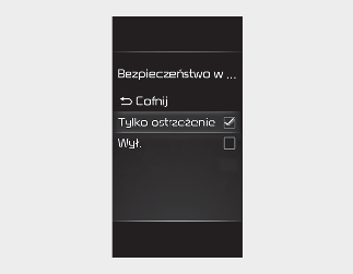 W przypadku wybrania opcji „Warning only” (Tylko ostrzeżenie) system ostrzegania o ryzyku kolizji w martwym polu będzie ostrzegał kierowcę za pośrednictwem komunikatu ostrzegawczego i sygnału dźwiękowego w zależności od poziomu ryzyka kolizji.