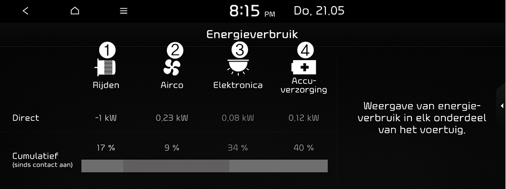 U kunt het actuele energieverbruik voor elk systeem van de auto controleren.
