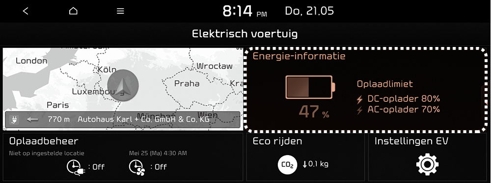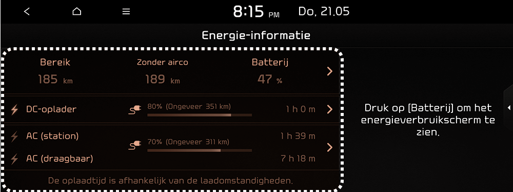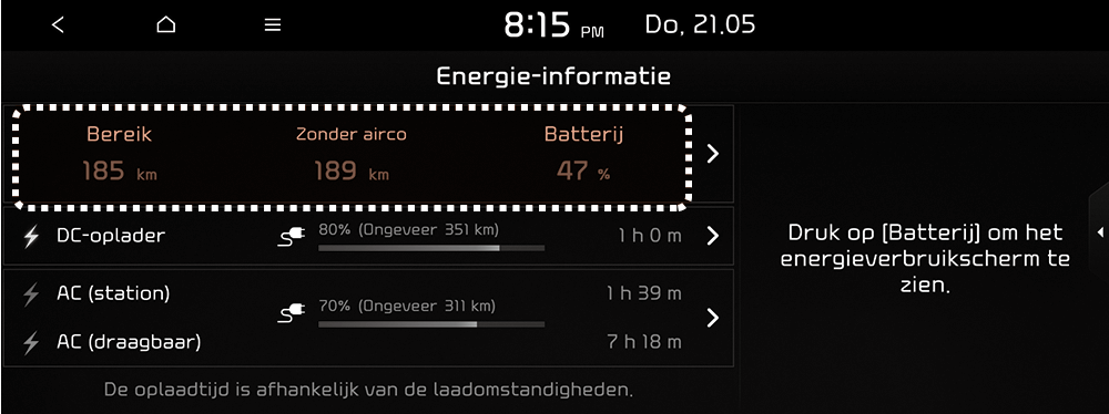 Selecteer 'EV → Energy information (energie-informatie) → Driving range, battery (afstandsbereik, batterij)' op het scherm.