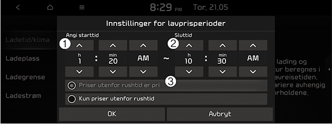 Selecteer 'EV → Charge management (laadbeheer) → Reserved charging and Climate Control (geplande laadprocedure en klimaatregeling) → Reserved Charging (geplande laadprocedure)→ Off-peak time settings (instellingen daluren)' op het scherm.