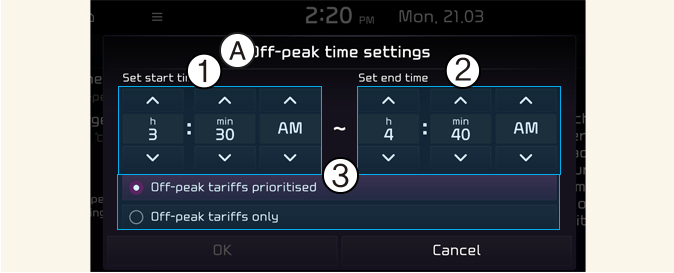 Jūs varat iestatīt datumu un laiku, kad jāveic akumulatora uzlāde, un klimata kontroles temperatūru. Tāpat varat atlasīt laiku, kad jāsāk uzlāde, izmantojot zema pieprasījuma perioda iestatījumu.