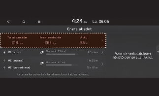 Valitse näytöllä ”EV → Energy information (Energiatiedot)→ Driving range, battery’ (ajoalue, akku).