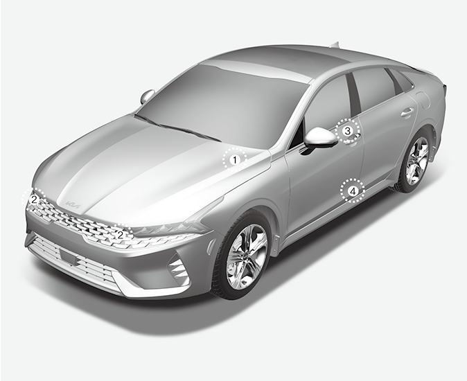 Des problèmes peuvent survenir si les angles d'installation des capteurs sont modifiés en raison de la déformation du pare-chocs avant, du module d'extrémité avant, de la carrosserie ou des portes avant où des capteurs de collision latérale sont installés. Faire contrôler et réparer le véhicule par un concessionnaire agréé Kia.