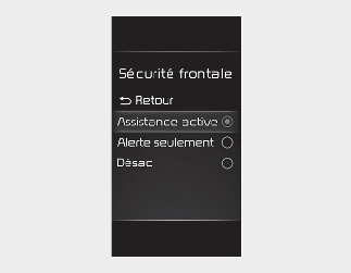 Si l'option « Warning Only » (Avertissement seulement) est activée, le système avertira le conducteur au moyen d'un message d’avertissement et d'un signal sonore en fonction du niveau de risque de collision. Le freinage ne sera pas assisté.
