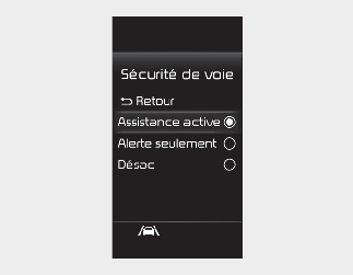 Si l’option « Assistance » est sélectionnée, le système actionnera automatiquement la direction assistée en cas de détection d’un franchissement de voie, et ce, afin d'aider le conducteur à maintenir le véhicule sur sa voie.