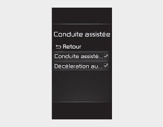 Le commutateur ENGINE START/STOP (démarrage/arrêt du moteur) à la position ON, sélectionnez ou désélectionnez « Driver Assistance → Driving Assist » (Assistance au conducteur - Assistance de conduite) à partir du menu « Settings » pour configurer l'utilisation ou non de chaque fonction.
