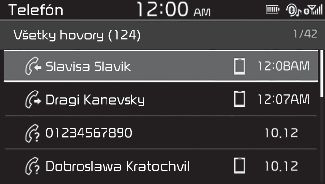 Ak je váš mobilný telefón pripojený k systému, môžete uskutočniť hovor výberom mena z histórie hovorov alebo zo zoznamu kontaktov.