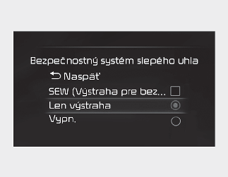 Ak je vybratá možnosť „Vypnuté“, výstraha pred mŕtvym uhlom sa vypne.