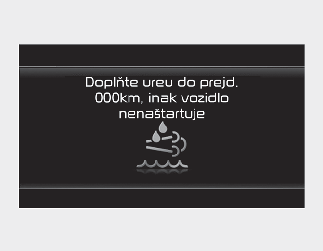 V opačnom prípade sa vozidlo nebude dať znovu naštartovať po vypnutí motora tlačidlom ENGINE START/STOP (štart/vypnutie motora). Na základe vzoru jazdy, stavu prostredia a profilu vozovky sa odpočítané zvyšné kilometre môžu líšiť od skutočnej vzdialenosti. Keď sa zobrazí hlásenie „Low Urea“ (Nedostatok karbamidu) alebo „Refill Urea“ (Doplňte karbamid), musí sa pridať dostatočné množstvo karbamidového roztoku. Keď sa zobrazí hlásenie „Refill Urea in 000 km or vehicle will not start“ (Doplňte karbamid o 000 km, ináč sa vozidlo nenaštartuje), doplňte dostatočné množstvo karbamidového roztoku.