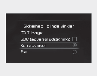 Hvis du ændrer indstillingen fra 'Fra' til 'Kun advarsel', blinker advarselslampen på det udvendige bakspejle i tre sekunder.